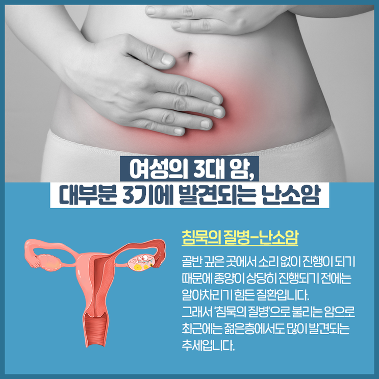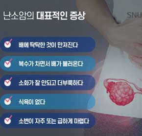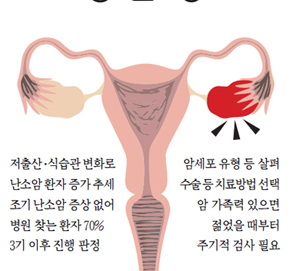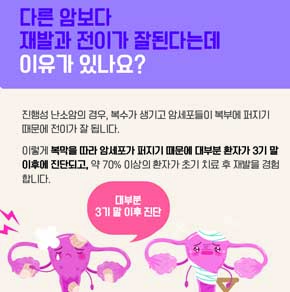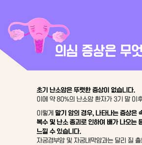 난소암이 발생률에 견주어서 여성 생식기 암 가운데 사망 확률이 제일 높은 이유는 초기에 독특한 자각 증상이 없기 때문이죠. 병원을 찾았을 때는 암이 무척 진행됐을 경우가 많습니다.