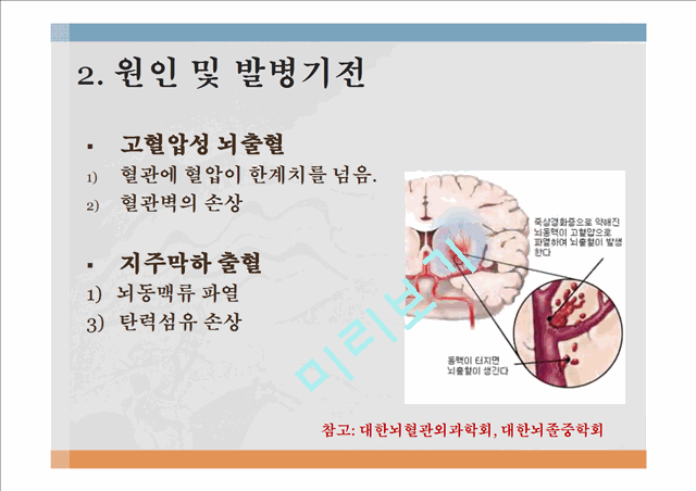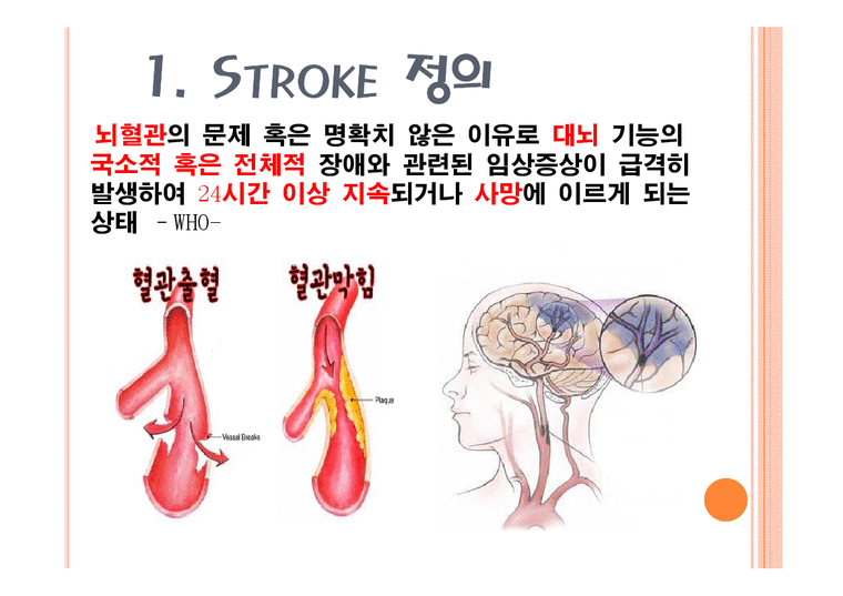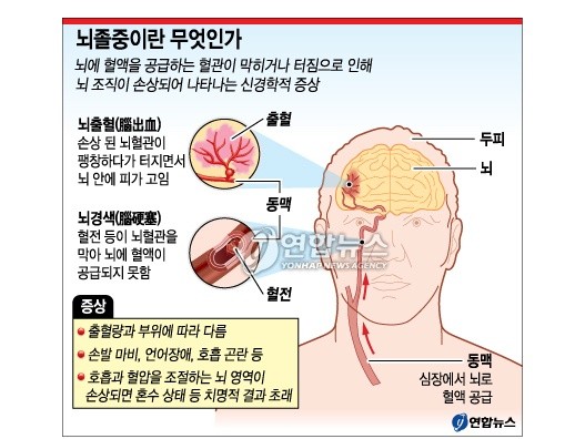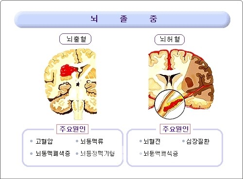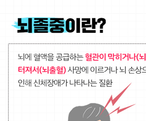 전 세계적으로 2초에 한명씩 발생하고, 6초에 한 명씩 사망하는 질병으로 국내에서도 3대 사망 원인 중 하는 뇌졸중. 뇌졸중은 뇌 일부분에 혈액을 보급하는 혈관이 막히거나 터지면서 생기는 병으로 고혈압이 뇌졸중의 표준적인 이유가 되는 것 질환입니다. 뇌졸중은 뇌혈관이 막히거나 터져서 뇌세포가 손상되서 출현하는 신경학적 증상이예요.