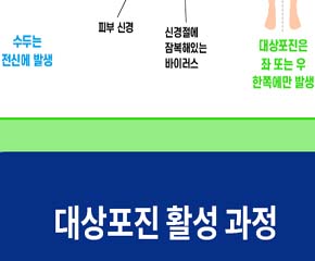 대상포진은 수두 바이러스가 소아기에 수두를 일으키고 나서 신경 부근에 무증상으로 잠복해 있다가 면역력이 감량하게 되면 신경을 타고 나와서 피부에 발진과 수포를 만들어서 큰 통증을 발생시키는 질환이에요.