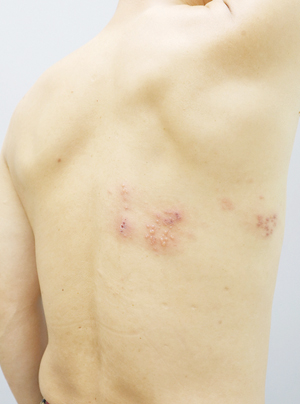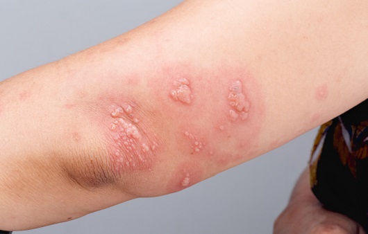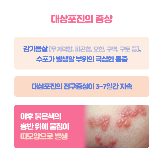 물집은 보통 몸이나 얼굴 한쪽에 생기며 신경을 따라서 특정한 패턴을 따라 띠같이 보여집니다니다. 발진은 가렵거나 열감이 이 있을 수 있고요.