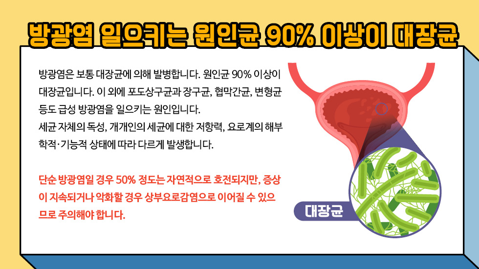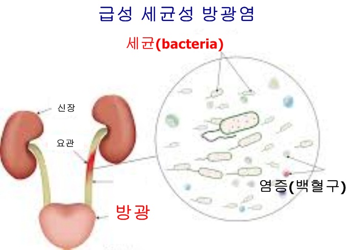 급성 방광염의 경우 80% 이상 대장균으로 인해 발병나게 되며 그외에 포도상구균, 간균 등이 까닭이 될 수 있습니다.