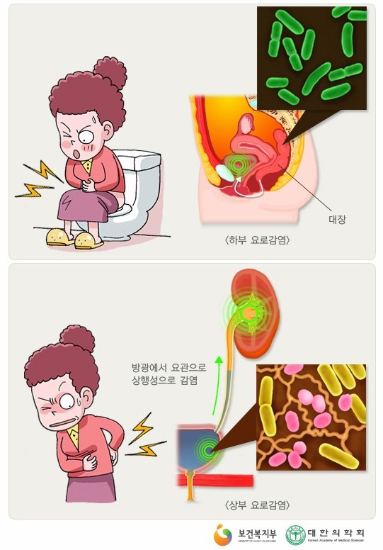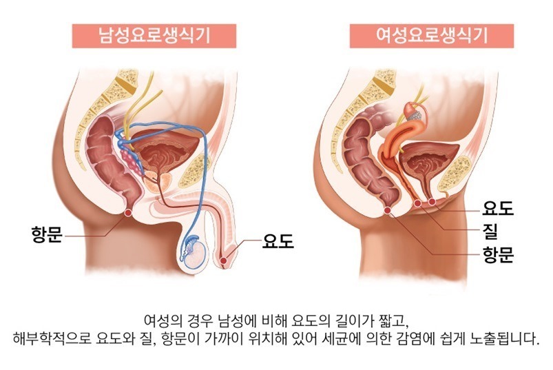 해부학적으로 여성은 남성에 비교하여서 요도가 짧아 회음부와 질 입구에 세균이 쉽게 번식하여 상행성(하부기관에서 상부기관으로) 감염을 일으키기 쉽기 때문이고요.