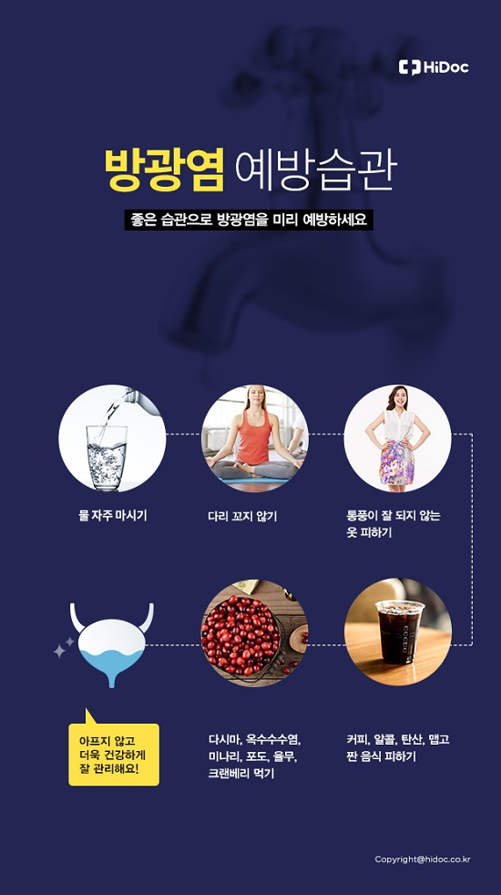합병증을 미리 막기 위한 방광염 증상이 나타나면 할 수 있는 한 빨리 치료를 받아야 하고, 알맞은 관리를 통해 튼튼한 요로를 지탱하면서 방광염의 불편함을 피할 수 있다고 생각해요.
