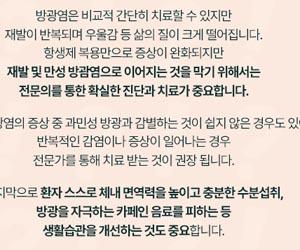 만성이나 신장감염까지 진행되기 전에 증상이 의심된다면 검사를 받고 알맞은 치료와 관리로 방광염에서 벗어나시는 게 좋다고 합니다. 이처럼 방광염 증상과 이유가 되는 것 그리고 예방과 유의할 점에 관해서 알아봤습니다.