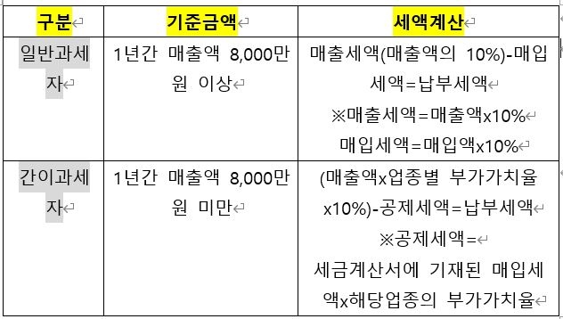 납부 기한과 방법은 뒤쪽에서 알아보도록 하고 일전에, 개인사업자의 부가세 신고에 있어서는 일반과세자와 간이과세자를 구분하여 알아봐야 해요.