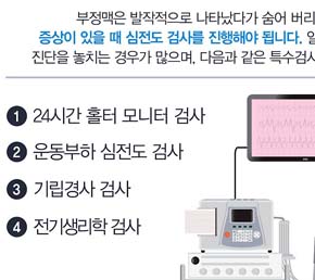 홀터 모니터링: 홀터 모니터링은 하루 이상의 시간 동안 심전도를 기록하는 방법이라고 합니다. 이 방법은 부정맥이 불규칙하게 일어나는 되었다면에 유용합니다.
