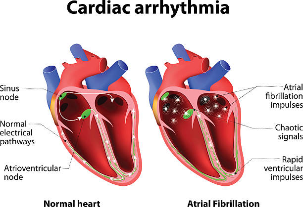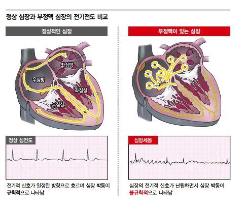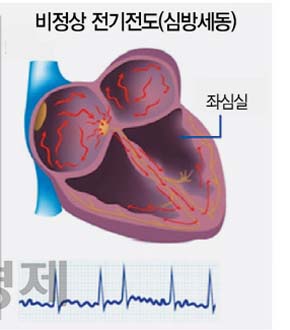 치명적인 부정맥 중 최고 특징적인 건 심방세동입니다. 심방세동은 심장 내부 심방의 여기저기에서 상당히 빠르고 들쑥날쑥한 잔떨림이 나타나는 증상으로, 뇌졸중과 심부전의 원인이 되요.