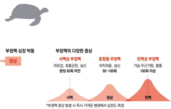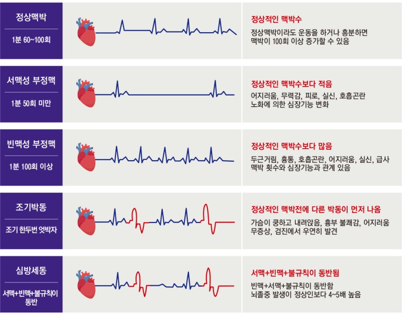 각별히빈맥(심장 박동이 빨라지는 것) 상황에서 식은땀이 나고 혈압이 감소하면 날쌔게 응급실에 내방해 부정맥 가부를 확인하는 게 좋고요. 흔하게 심장 박동수의 정상 범위는 분당 60회에서 100회까지다. 부정맥으로 인해 심장 박동수가 분당 100회 이상인 경우는 빈맥, 분당 60회 이하인 경우는 서맥입니다.