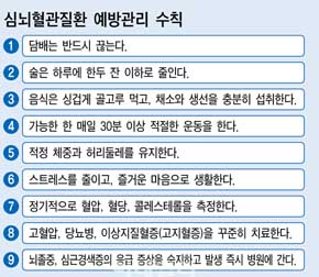 콜레스테롤과 혈압을 제어해야하고요. 건전한 체중을 보전해야 하고요. 규칙적인 운동이 필요하고요. 스트레스를 관리해야 합니다. 알코올과 카페인을 제한적으로 섭취해야 하며 금연이 필요합니다.