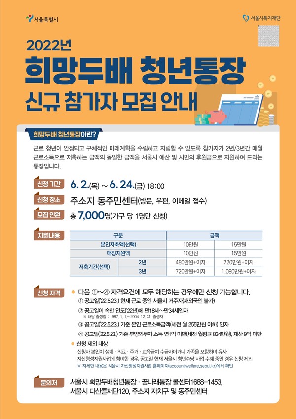 서울시 희망 두 배청년통장, 꿈나래 통장 콜센터 1688-1453