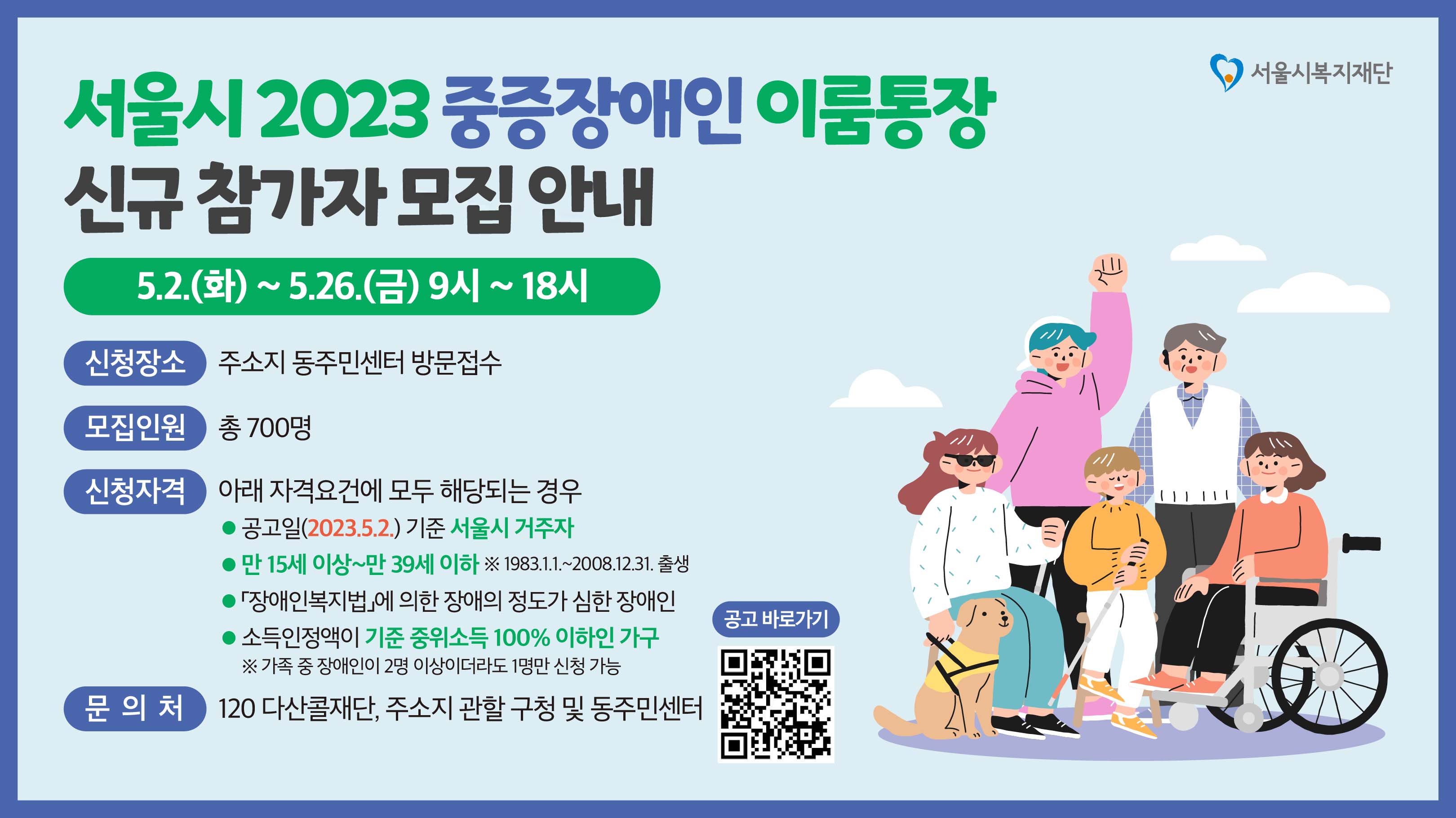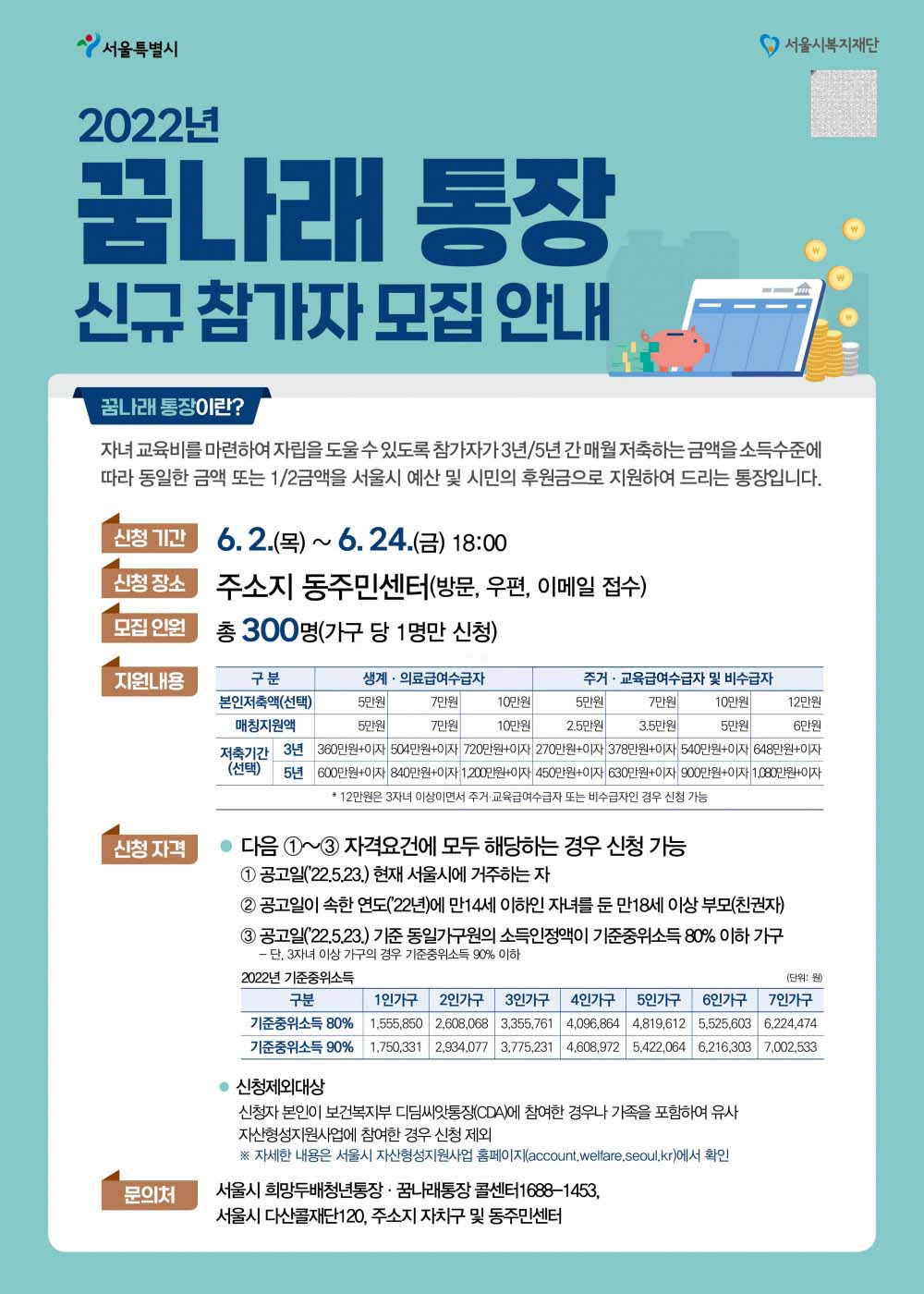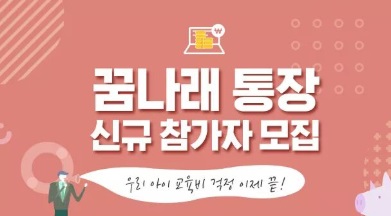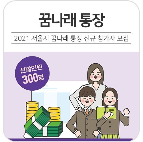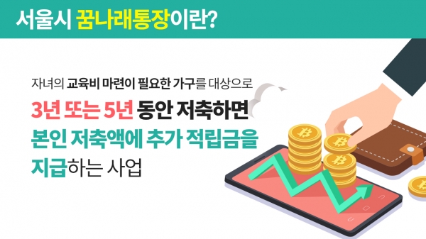 서울시에서는 자녀의 교육비 마련을 원조하는「꿈나래통장」의 2023년 신규 참여자를 하단과 같이 모집한다고 밝혔습니다.
