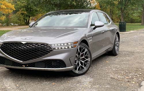 외관은 명문 귀족 가문 문장 형태의 당당하고 품위 있는 크레스트 그릴과 그릴 상단에 적용된 크롬 가니쉬를 통해 웅장함을 떨치고, 사이드미러 언더 커버 크롬 코팅으로 고급감을 증진했으며, 제네시스의 시그니처 디자인 요소인 쿼드램프는 브랜드의 독창성을 재현하면서 특이한 정체성을 수여 해요.