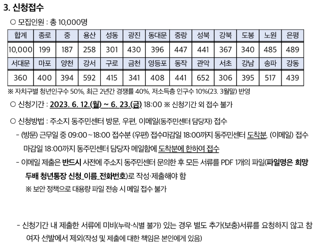 이번 2023년 희망두배 청년통장 지원에 참여를 희망하는 청년은 해당 기간 주소지 동주민센터를 직접 내원해 가입신청서 및 구비서류를 제출하면 되며 우편 및 이메일 신청도 가능하고요.