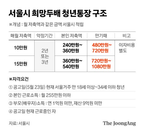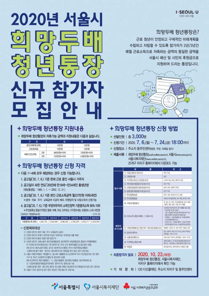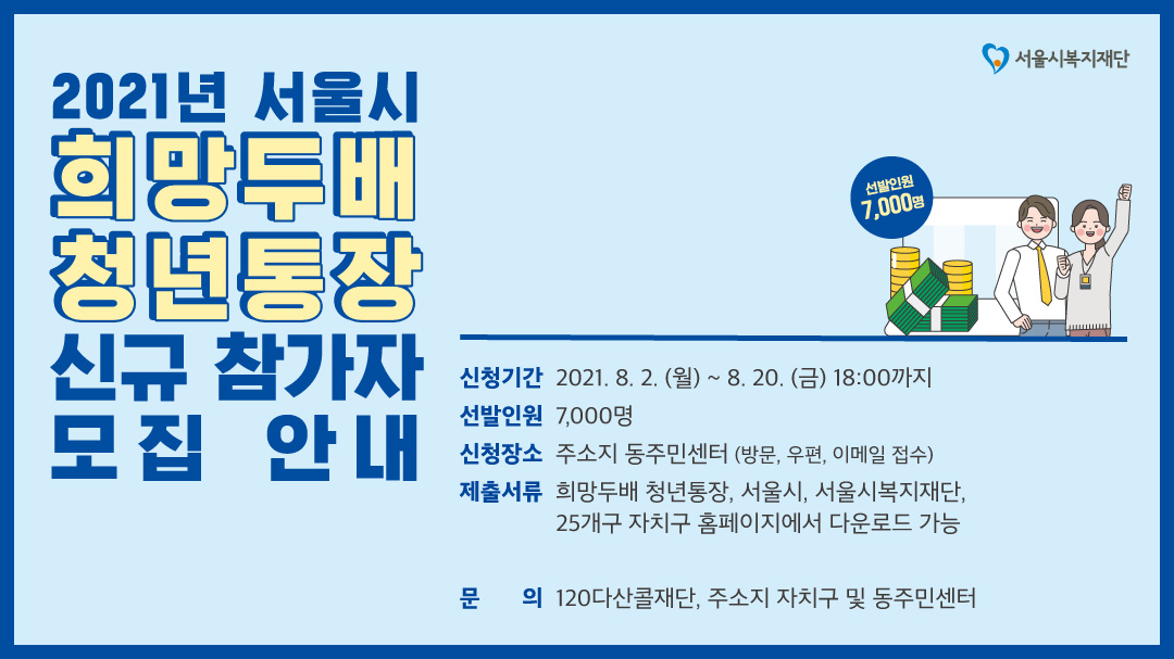 서울시는 청년들의 힘든 경제생활 속에 조금이나마 근로하는 청년들을 위해 희망 두 배 청년 통장이라고 하는 제도를 구축됐어요.