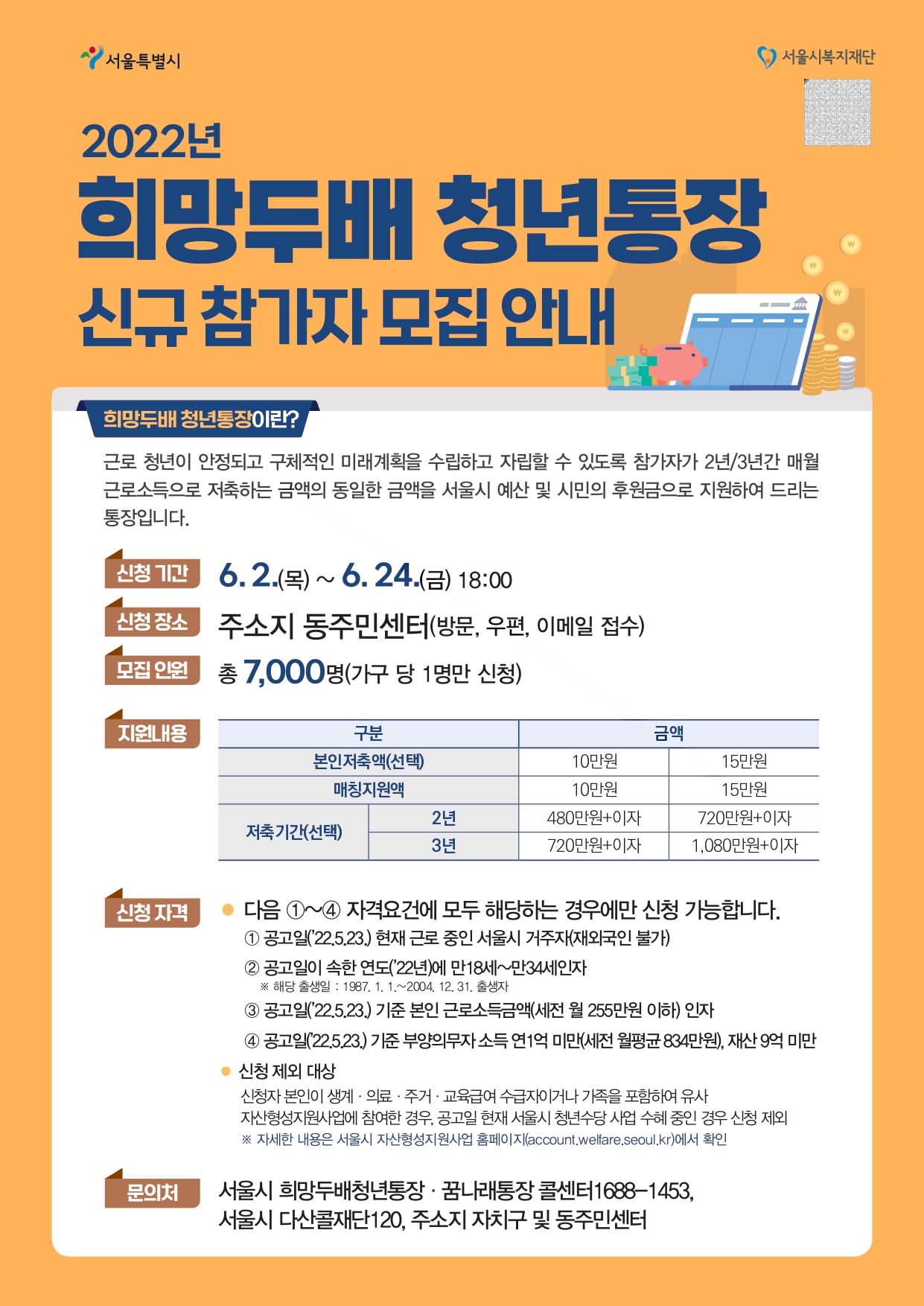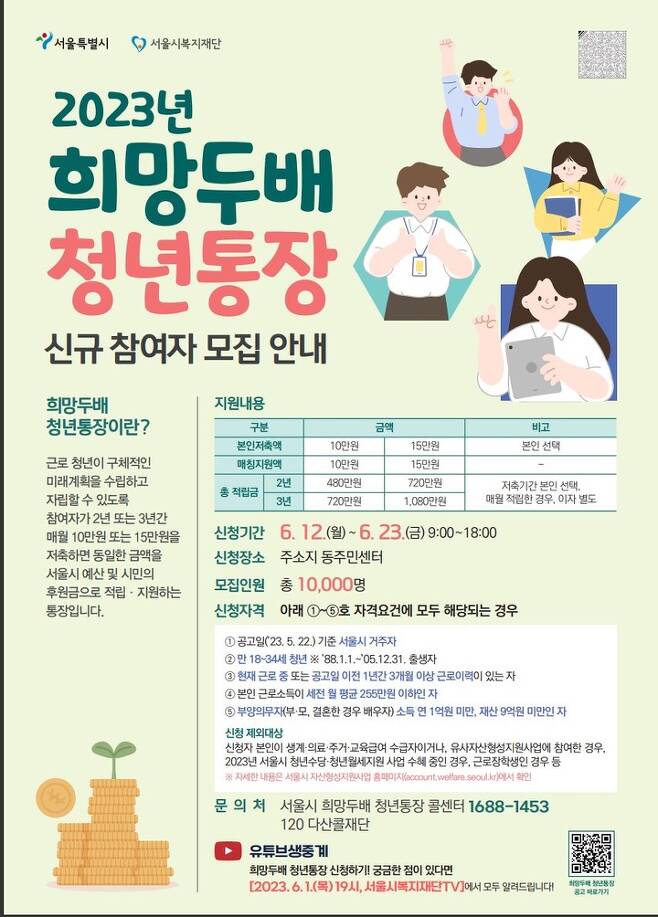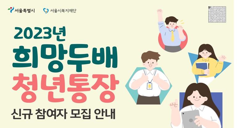 서울시는 2023년 6월 12일부터 23일까지 일하는 청년의 씨앗자금 조성과 미래계획 설계를 돕는 '희망두배 청년통장' 신규 참여자 1만 명을 모집한다고 밝혔습니다.